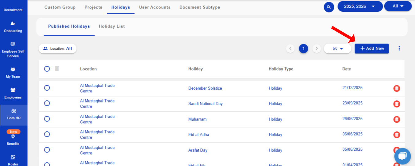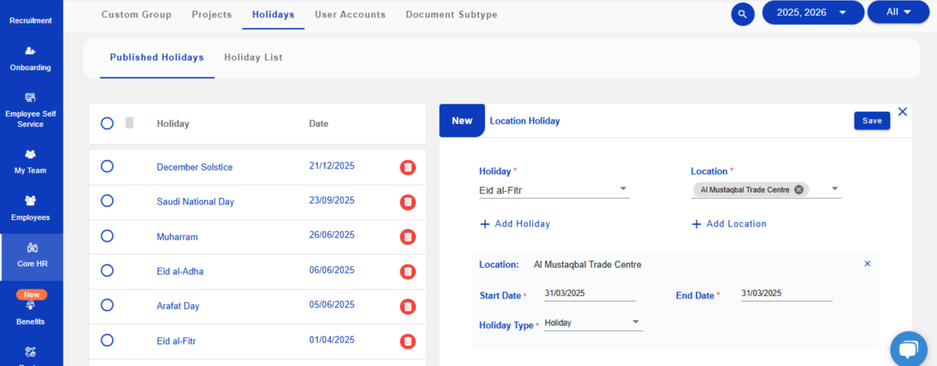CoreHR → Employee Data Management → Holidays → Published Holidays