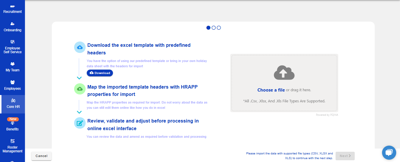 Once the details are updated, upload the file back into the system by clicking Choose a file or dragging the file into the upload area.