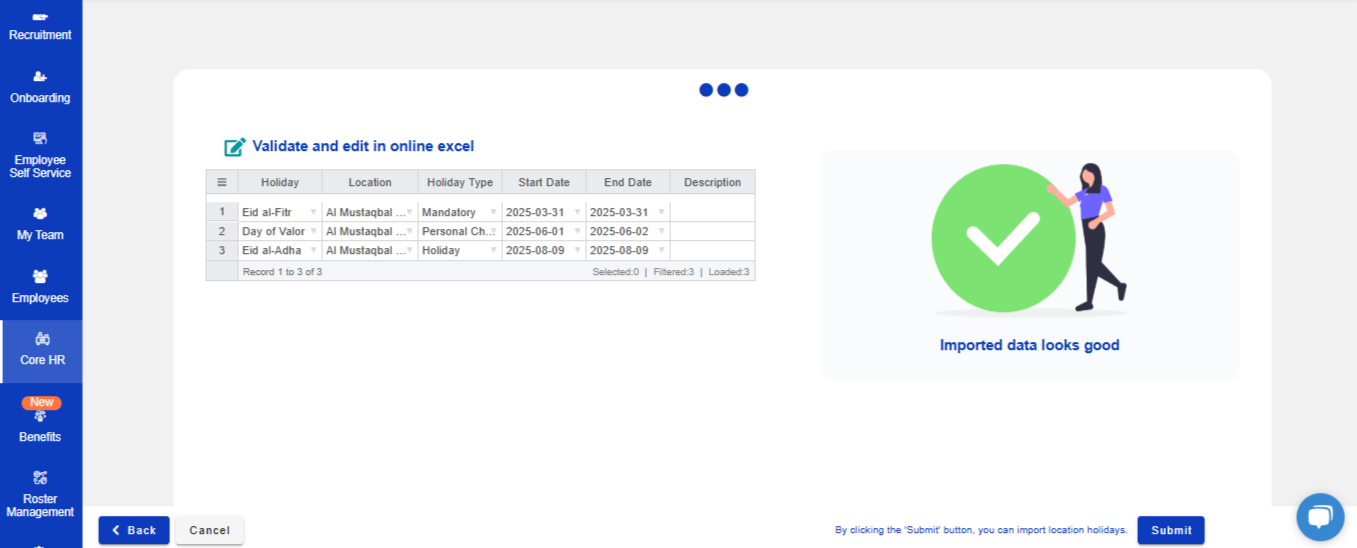 CoreHR → Employee Data Management → Holidays The Holiday module allows organizations to define and manage official holidays for employees. Companies can configure holiday calendars based on locations, or employee groups, ensuring compliance with ...