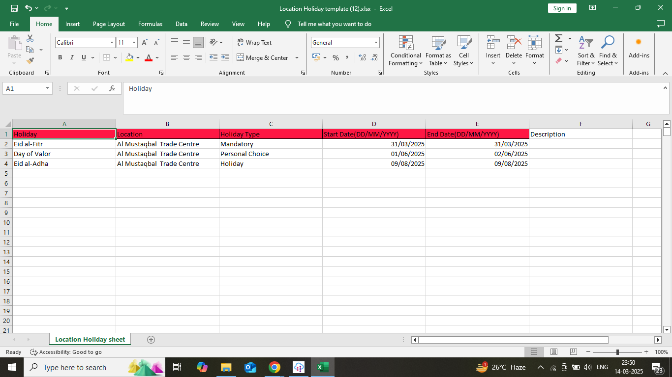 Open the file and enter the holiday details, including Holiday Name, Location or Custom Group (based on configuration), Holiday Type, Start and End Date, and Description.