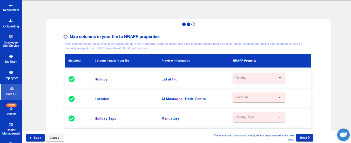 After uploading, you will be directed to the Match Columns section to align the Excel columns with system fields. This step is required if you are using a custom Excel file instead of the provided template.