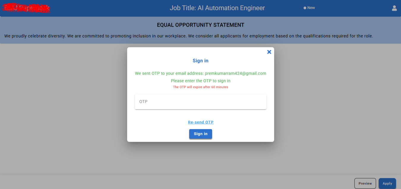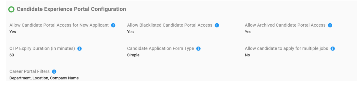 If the Candidate Experience Portal access is enabled in the Recruitment Settings (refer to Page No. 24 for configuration details), only then will candidates be able to log in using an OTP to track the status of their hiring process.
