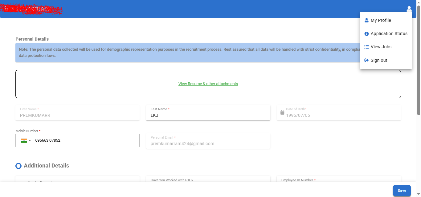 By clicking on My Profile, the candidate will see their previously submitted resume and details pre-filled. If they wish to add or modify any information, they can do so and click Save. The updated information will automatically reflect in the Job Candidates section.