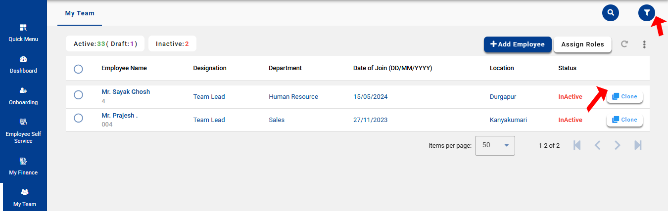 My Team → Team Summary → Filter with Status - Inactive → Select the Employee and click Clone