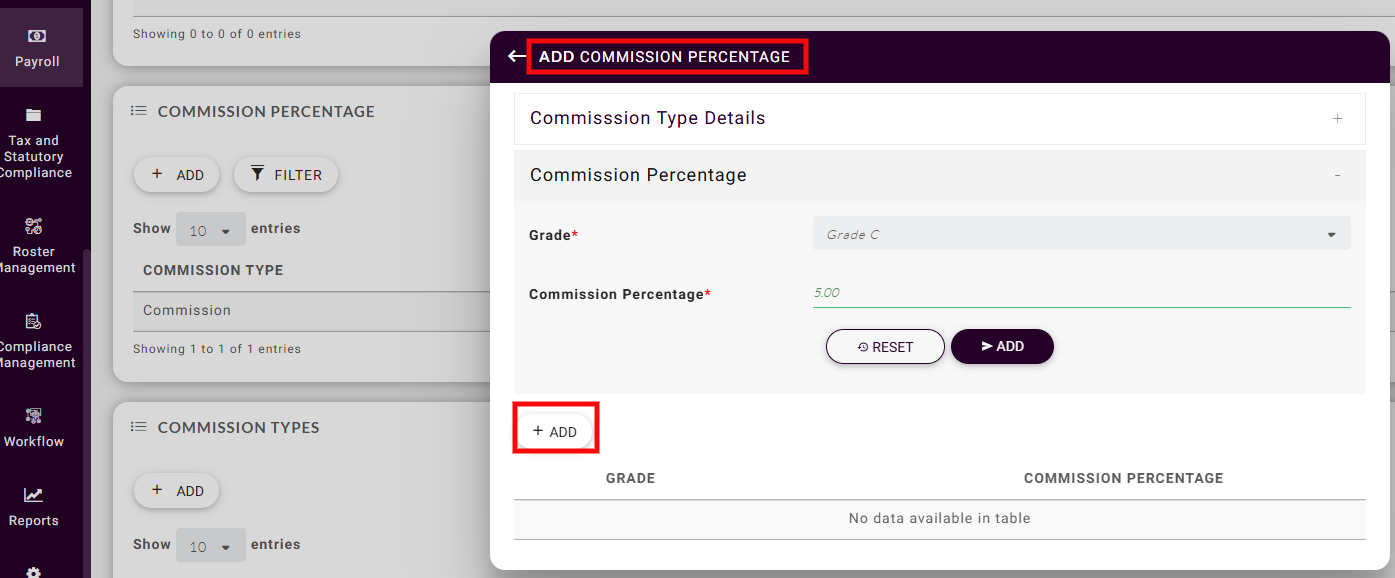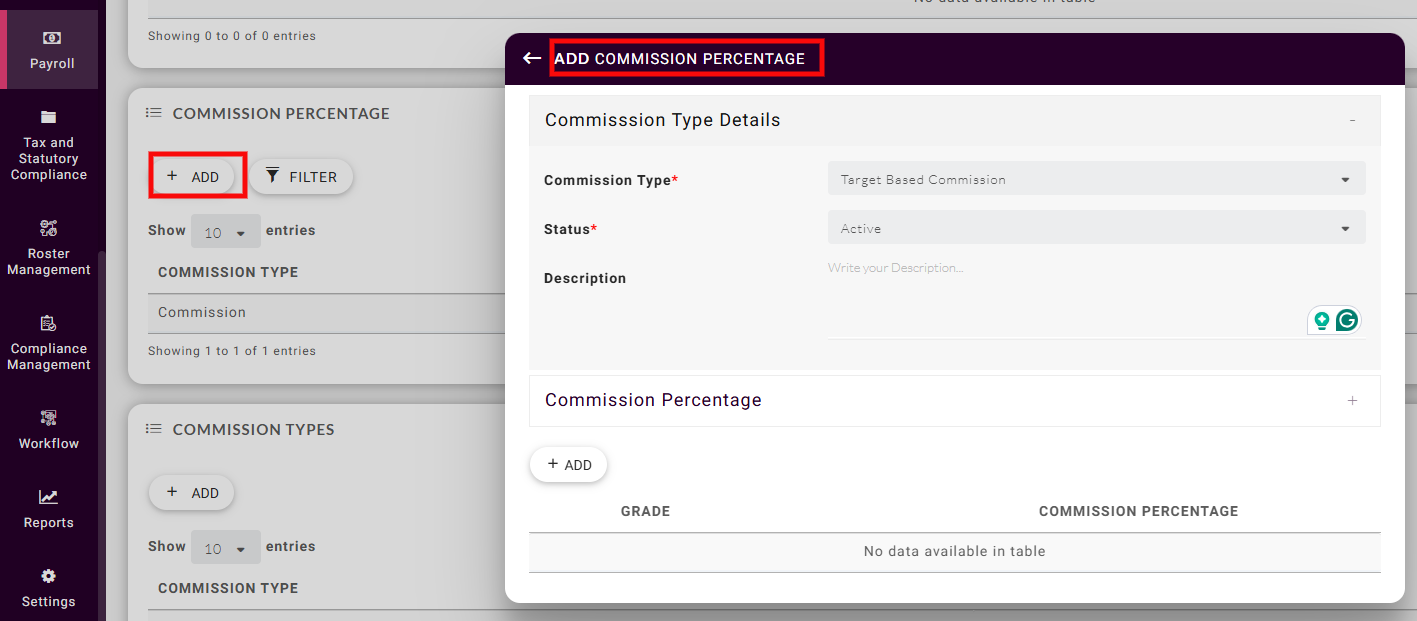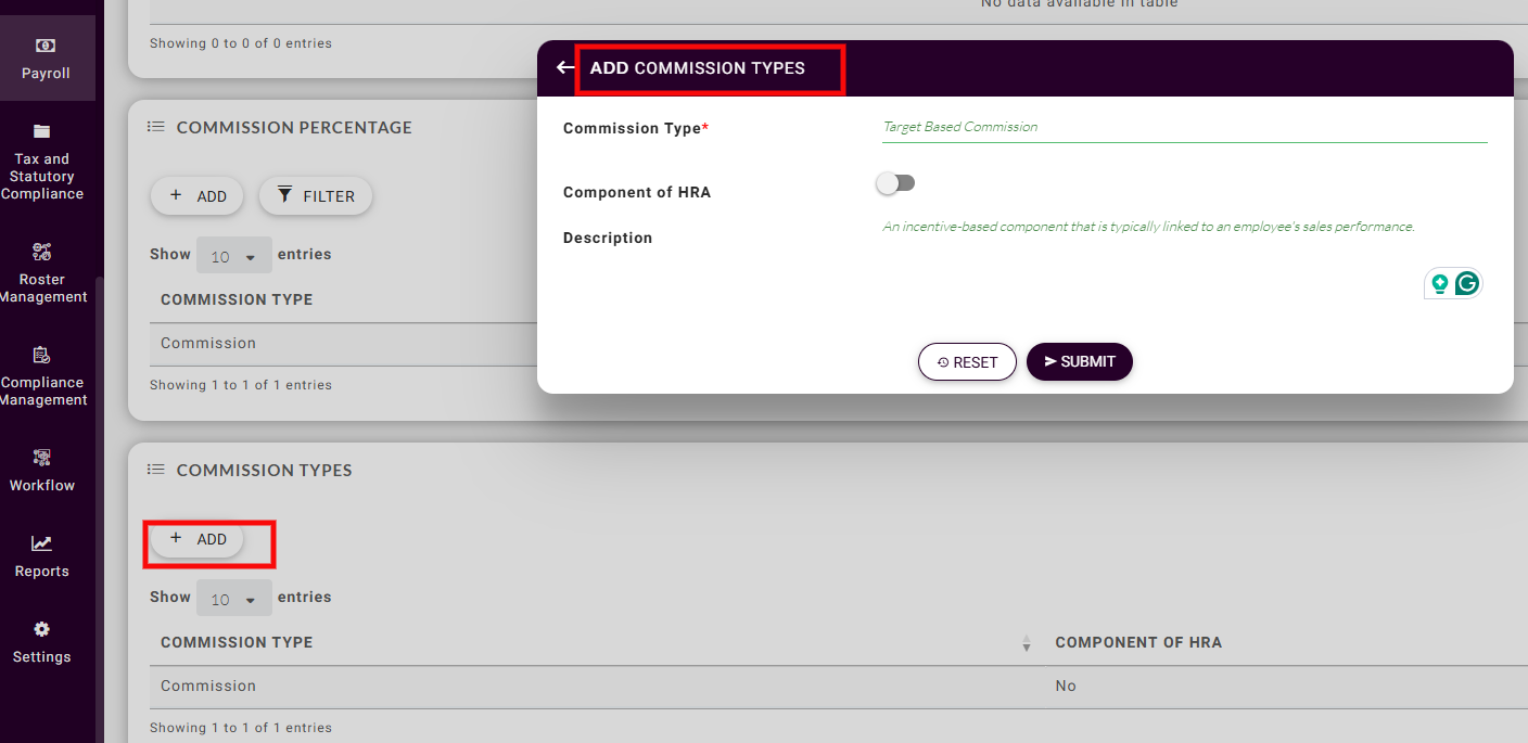 Upon clicking to add, you will be prompted to create and define the Commission Type applicable within the organization. This could include various commission types such as Sales Commission, Performance-Based Commission, Target-Based Commission, etc.