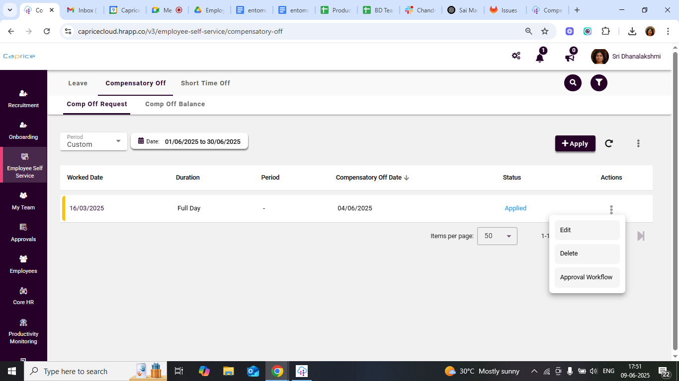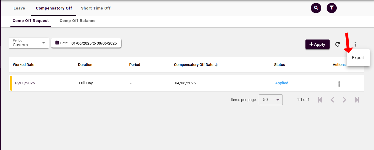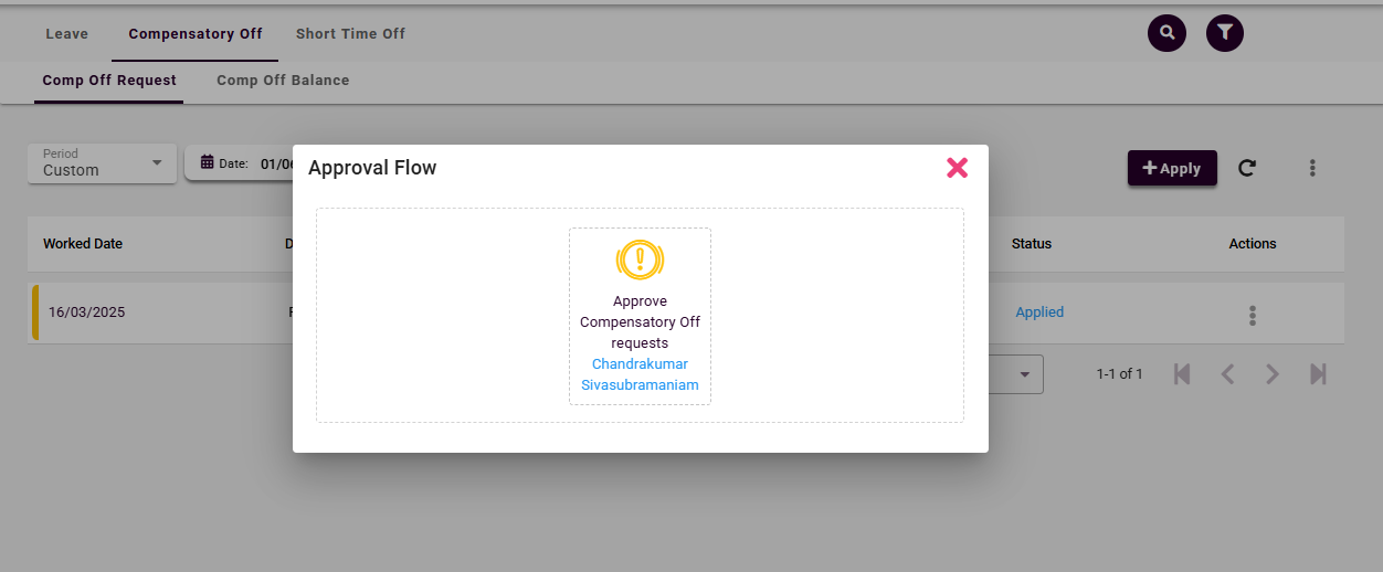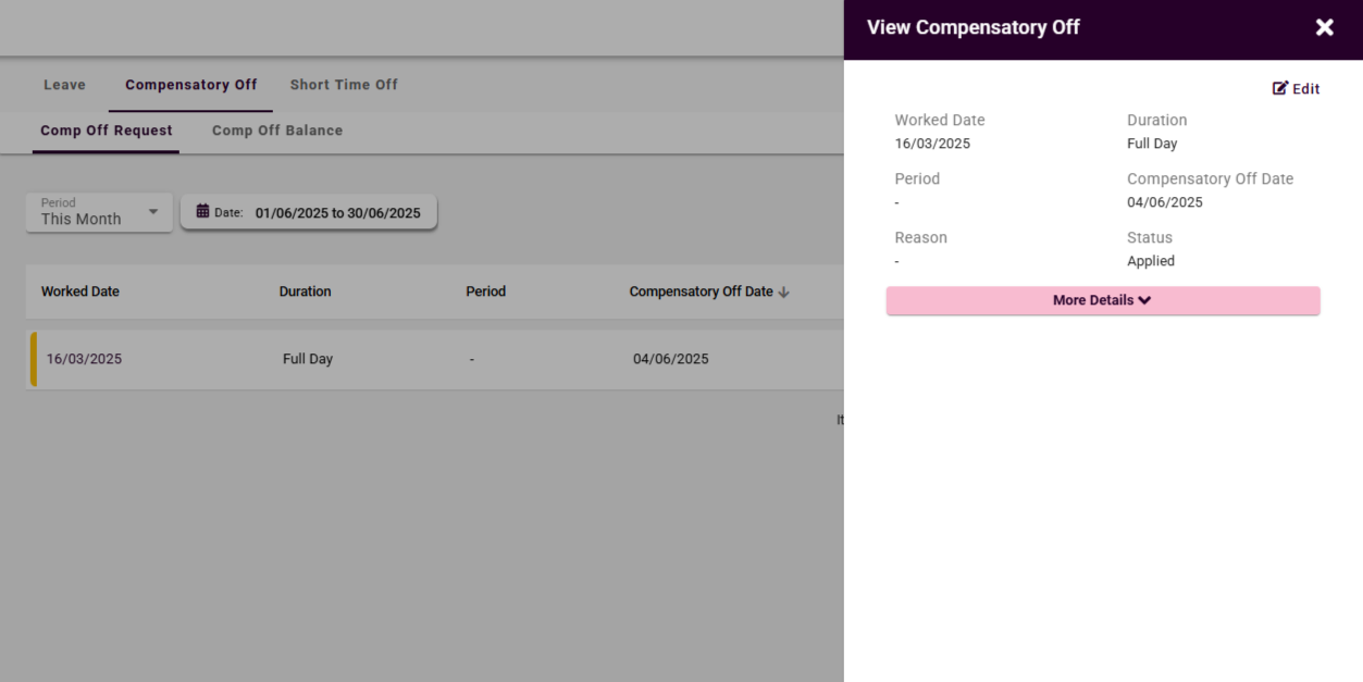 To view comp off data: Select the record, and a pop-up window will open displaying the applied leave request.