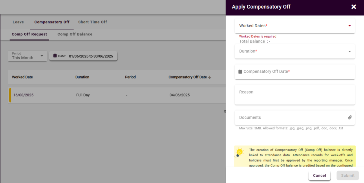 Please note, you can submit a Comp Off request only if you have an available Comp Off balance. If there is no eligible balance, the system will display a validation message indicating that you are not eligible to apply.