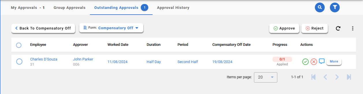 Managers or approvers can view all the comp off requests that are pending approval for their team members. They have the ability to take action on these requests, either by approving or rejecting them based on the information provided.
