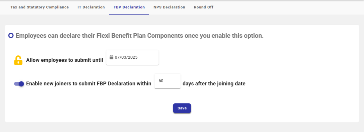 By default: The FBP Declaration Lock Date is set to 30th April of every year and For new employees, the declaration window is 60 days from the date of joining.