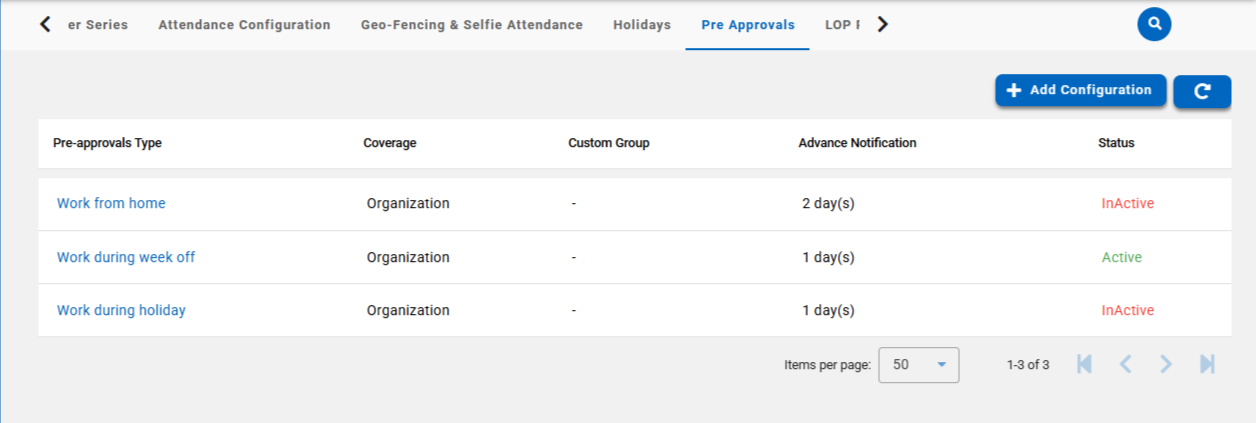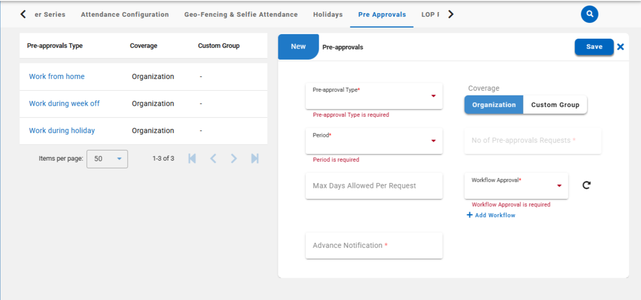You can define the following parameters based on your organization’s policy: Pre-approval type, Coverage, Number of pre-approval requests per period, Maximum days allowed per request, Approval Workflow and Advance Notification.