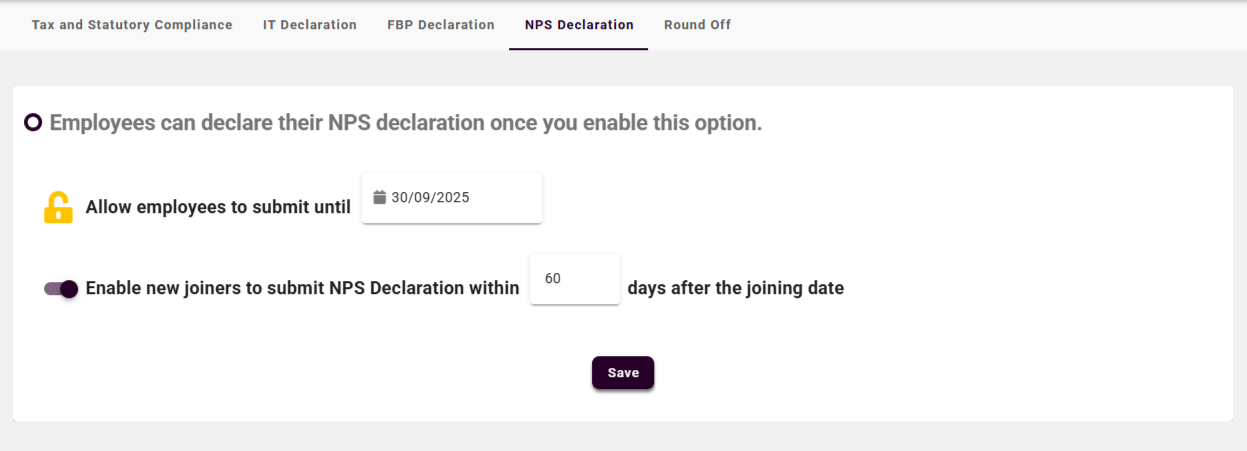 For new employees, enable and configure the number of days (from the date of joining) during which they are allowed to submit their NPS declaration.