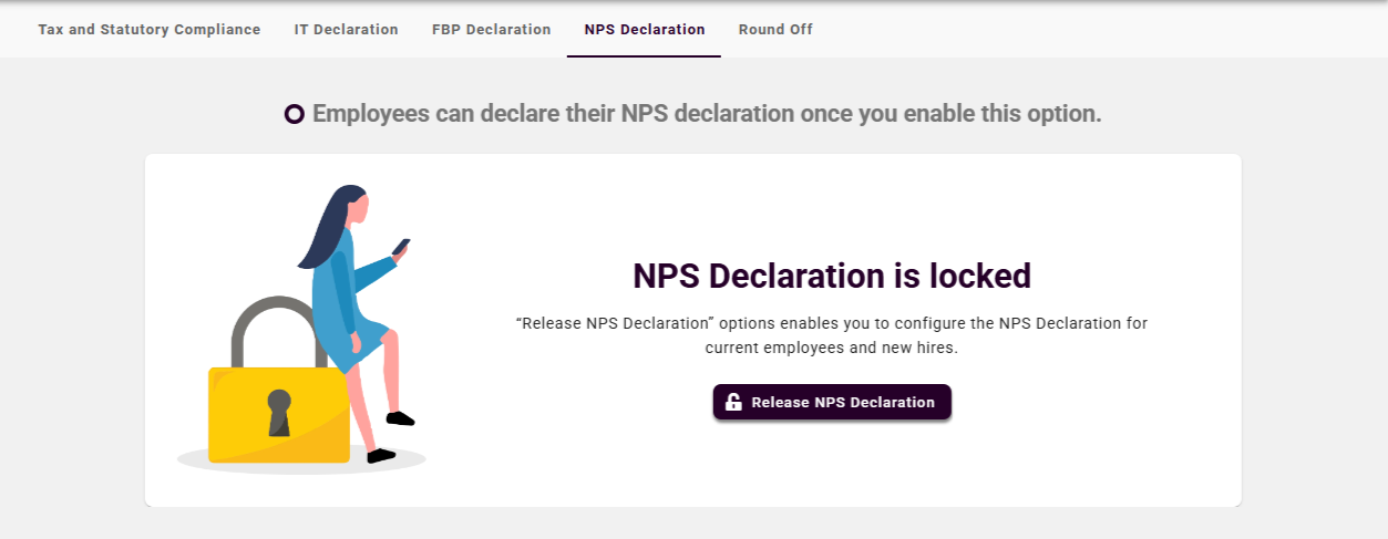 Click the Release NPS declaration button and set the Lock Date in the field Allow employees to submit NPS Declaration until.This defines the last date for employees to submit their NPS Declaration.