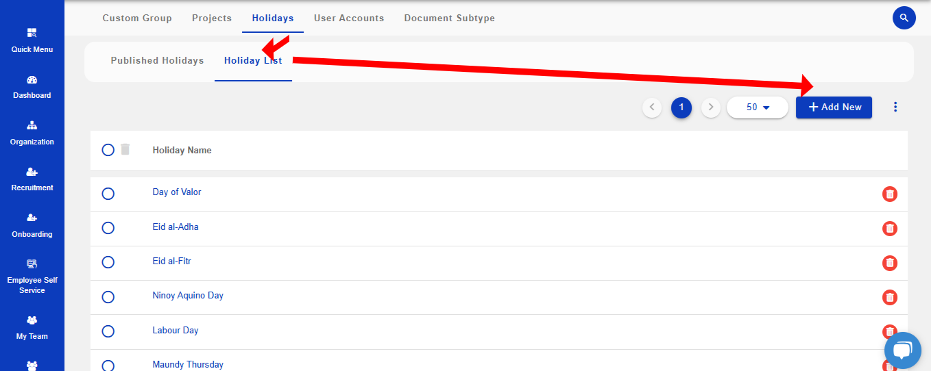 To create a holiday list, navigate to CoreHR from the left navigation menu and select the Employee Data Management & Holidays and then Holiday List tab. Click on +Add New input the holiday name and Save.