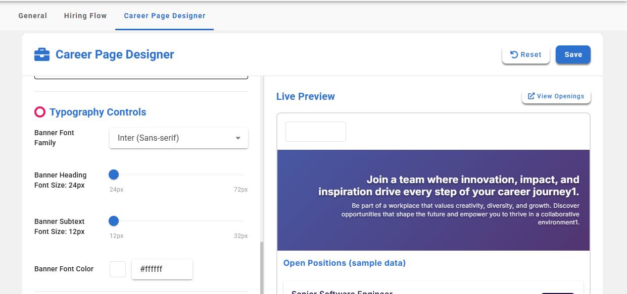 Navigate to Settings → Recruitment → Career Page Designer You can use all the components available in the module to get your career site banner. The available options include Brand Assets, Content Customization, Typography Controls, and Layout & ...