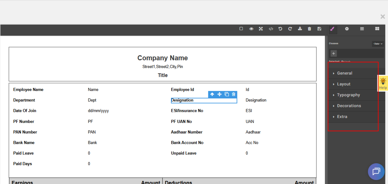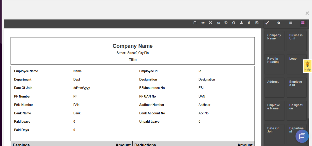 Drag & Drop Builder: Rearrange placeholders (Employee Info, Totals, Net Salary, Organization Contributions, etc.).