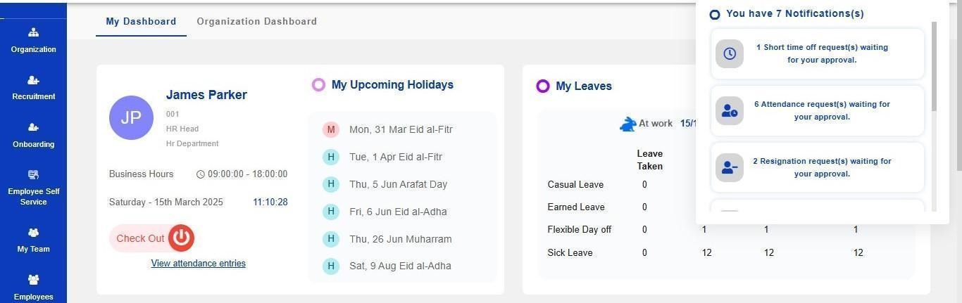 Users receive instant alerts for any approvals that require their attention, such as leave requests, attendance regularization, expense claims, or other workflow approvals.