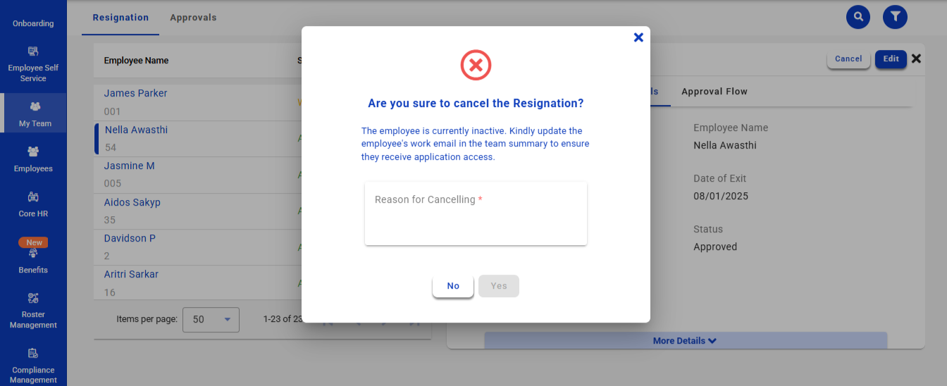 - To cancel the applied or approved resignation, click "Cancel" in the Action column and provide the reason for the cancellation. If the exit date is in the past and the resignation is approved, the employee data will become inactive. Once the resignation is canceled, the employee's data will automatically become active again, but HR will need to update the Work Email in the employee profile to enable system access.