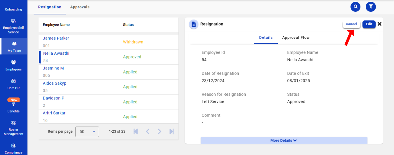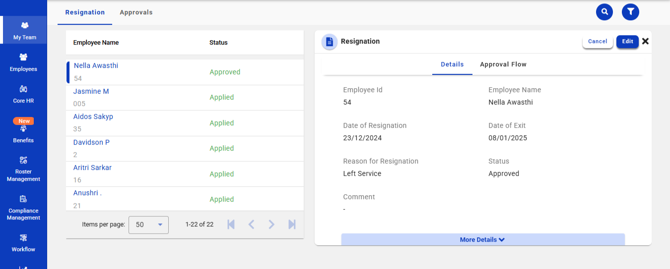 - To edit the applied or approved resignation, select the appropriate employee data and click "Edit" to update the details. Resignation details can only be updated for approved records when the payslip and full and final settlement have not been generated.