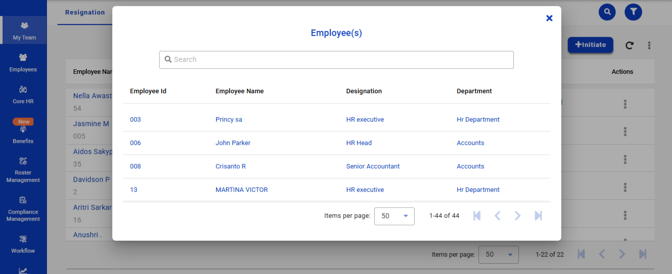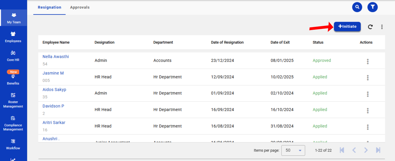 - Click the +Initiate button to select the employee for whom you need to initiate the resignation process. For Managers, the employee dropdown will be limited to their team members who report directly to them.