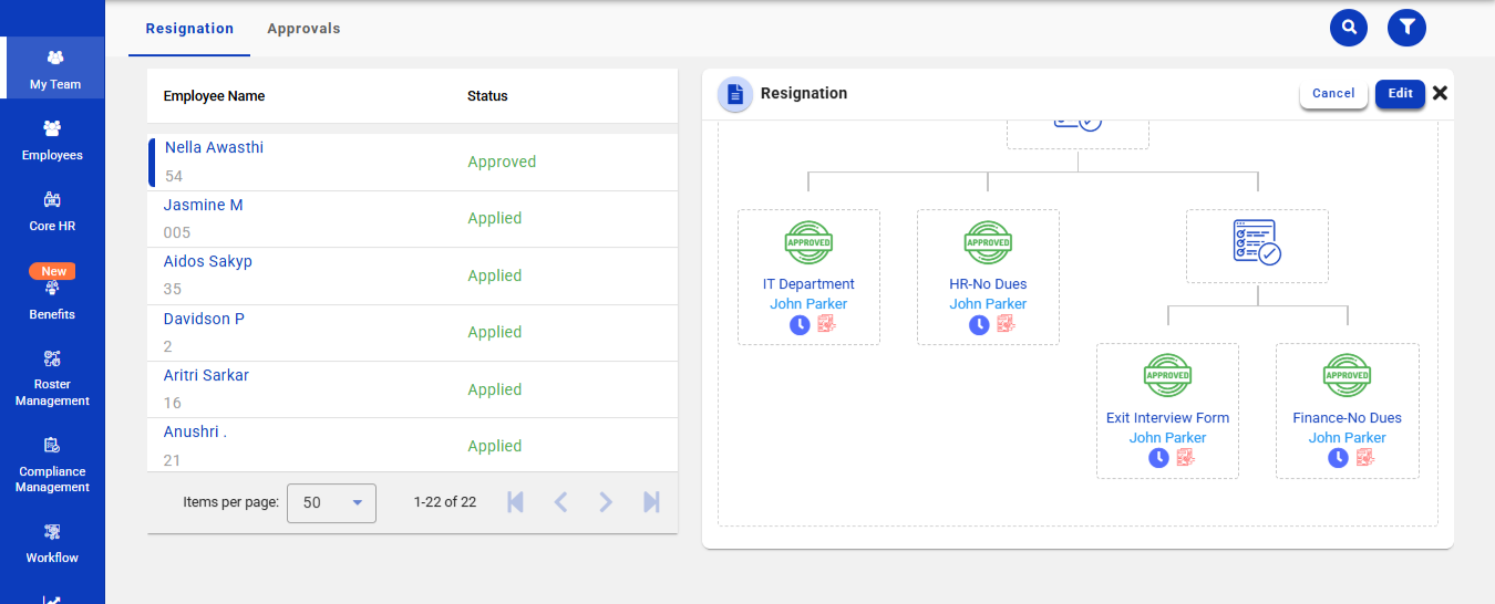 - To view the applied resignation record, select the appropriate employee data and click the "Details" tab to view the resignation details. You can also click the "Approval Flow" to see the approval process and the No Dues form submitted by the approvers.