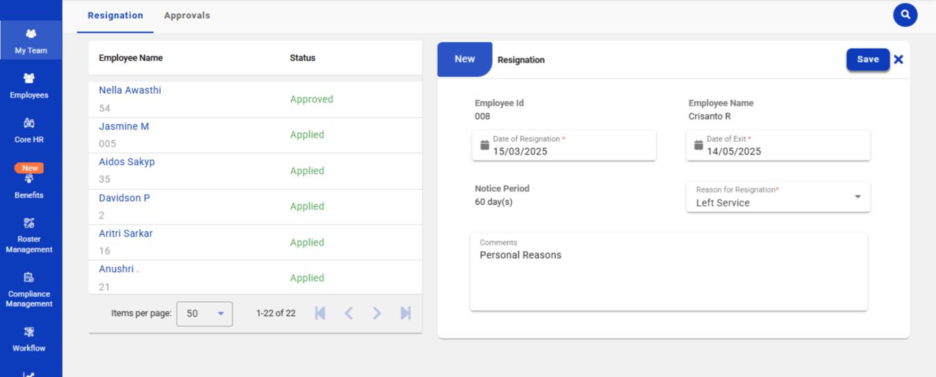 - You can edit the Resignation Date and Exit Date if necessary, and select the Reason for Resignation. Additionally, you can add comments if required.