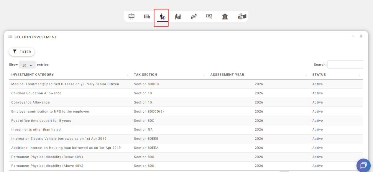 Navigate to Tax and Statutory Compliances → Tax Rules → Tax Section The tax sections for exemptions are pre-defined in the application based on the selected Old or New tax regime. Fig: Tax Section