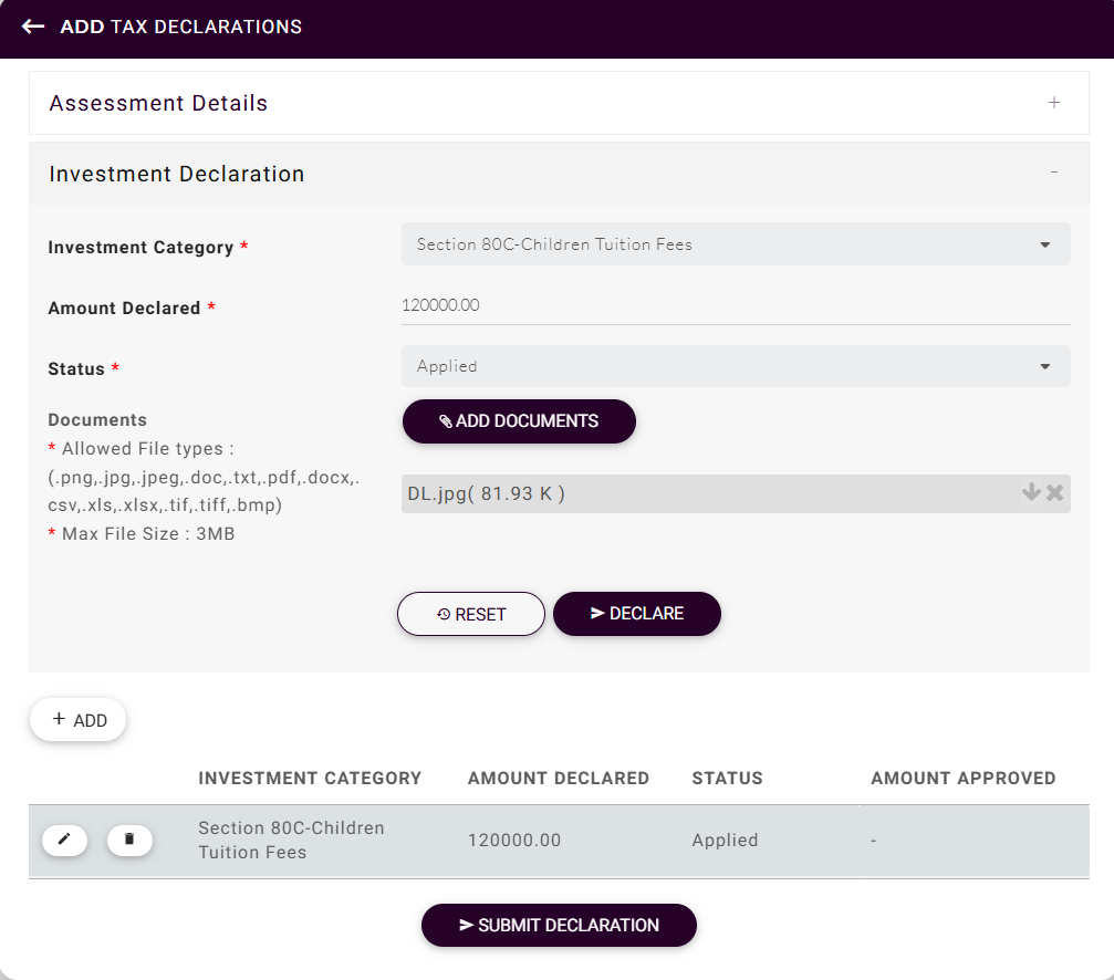 Click Declare.Repeat the process to add multiple investment categories using the Add button.