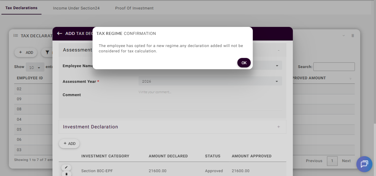 A pop-up warning will appear if the employee has chosen the New Regime, stating that declarations will not be considered for tax exemptions.