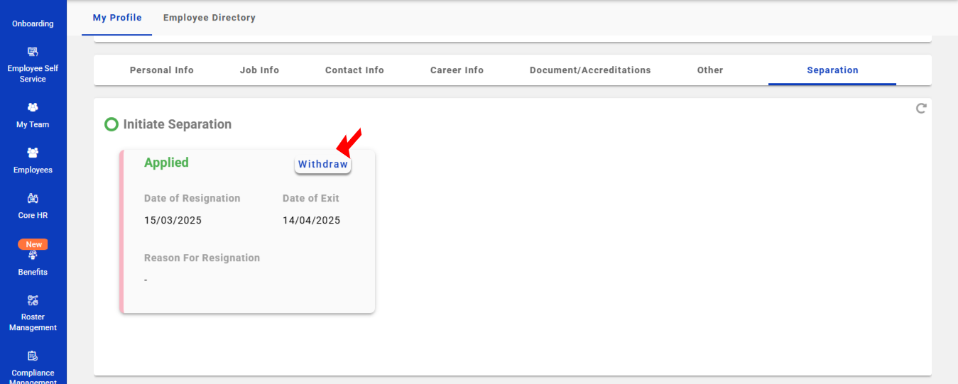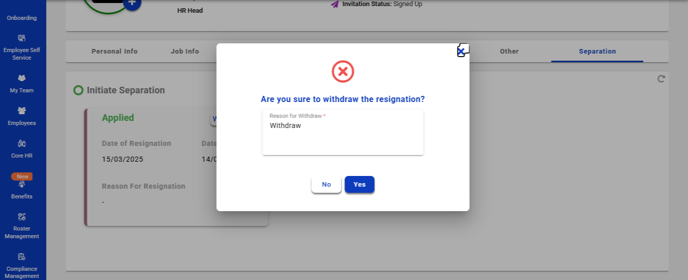 - Employees have the option to withdraw their resignation after it has been submitted. In the separation tab, click the "Withdraw" button. A pop-up window will appear asking for the reason for the withdrawal. Once the reason is provided, click "Yes" to submit the withdrawal request.