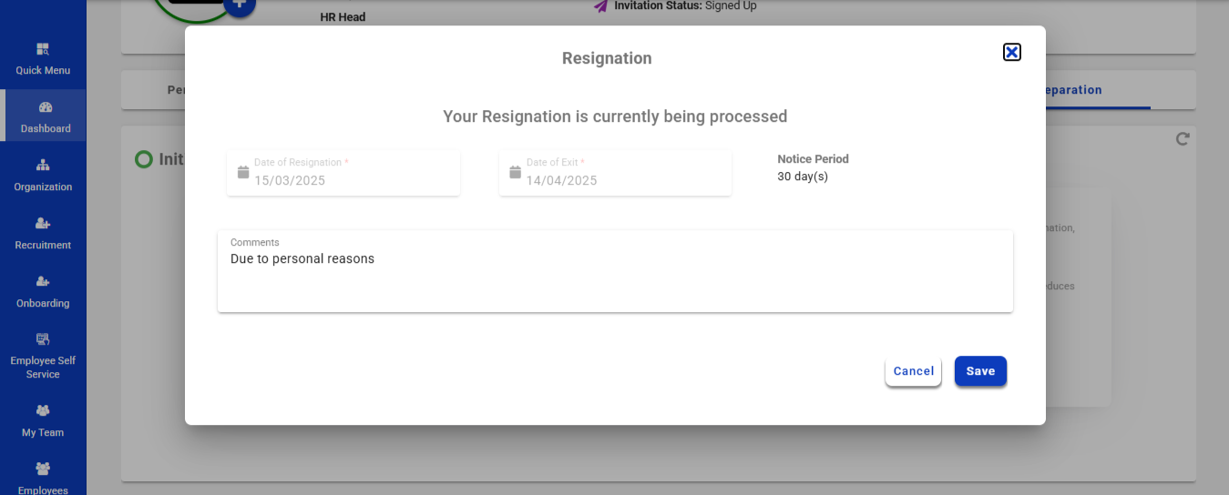 - The employee can update the reason for resignation and then click the Save button.