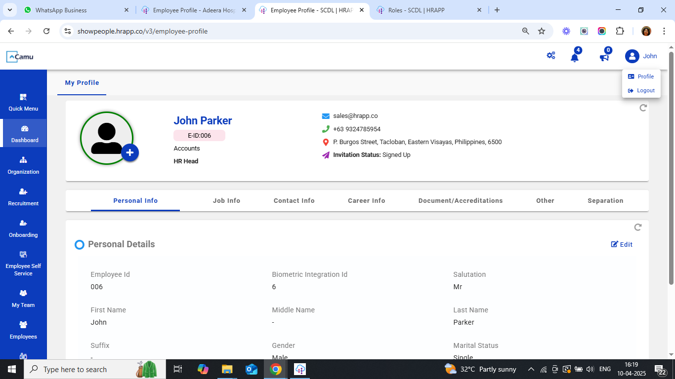 My Profile in the ESS portal provides employees with access to their personal and professional information maintained by the organization. It allows users to: