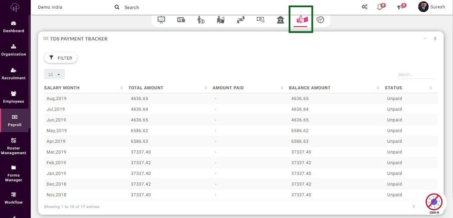 Tax and Statutory Compliances → Tax Rules → Top icon → TDS Payment Tracker → Click each month and update the details required.