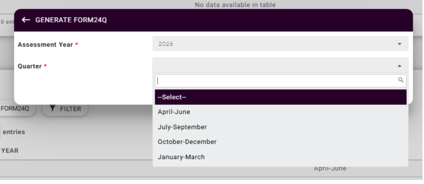 Tax and Statutory Compliances → Compliance Forms → Form 24Q → Generate 24Q and select all the quarters.