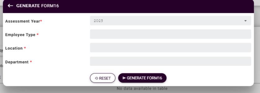 Tax and Statutory Compliances → Compliance Forms → Generate Form 16.