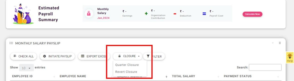 If all the payslip are finalized by March 2025, please initiate the financial closure process. Once the financial closure is complete, no modifications can be made or new payslips generated for that period. The application will lock the payroll generation for the entire year (April 2024 to March 2025), including leave data apply for that period. Please ensure to verify before proceeding.