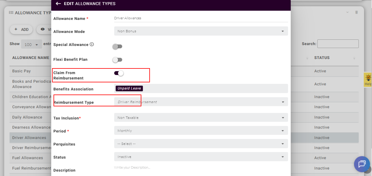 Click the Edit button for the selected allowance. Enable the Claim from Reimbursement flag and select the applicable Reimbursement Type(Eg: Fuel, Driver etc)