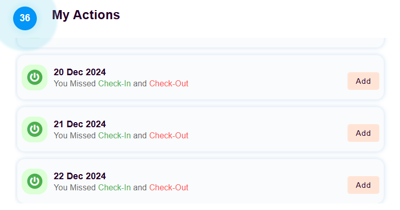 The Missed Attendance section under My Actions highlights instances where an employee has failed to check in or check out as per their scheduled work hours. It helps employees track and regularize their attendance to ensure accurate payroll processing and compliance with company policies.