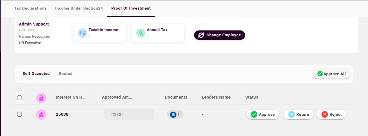 Once the employees submit the proofs for the Income Under Section 24 for Self-Occupied and Rented, as payroll admin you need to either approve or reject them. To do this,