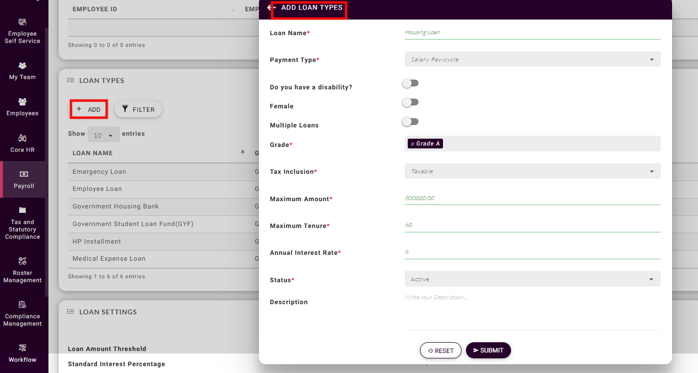 Grade | Select the grade of employees (Ex: Grade A, Level 2) to whom this loan is applicable. |