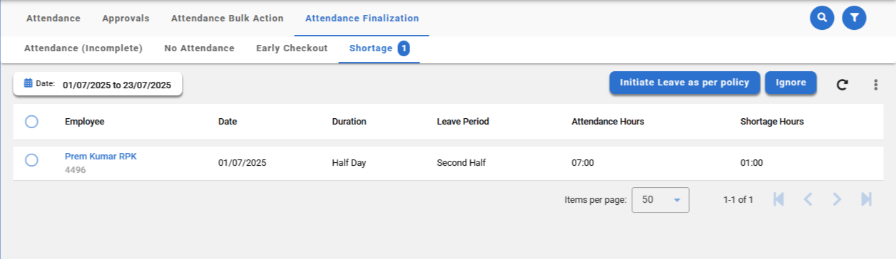 My Team → Attendance → Attendance Finalization This is applicable for the Managers to take action on missed attendance and approval-pending records. Managers can review and approve or reject these records, ensuring that all attendance data is ...