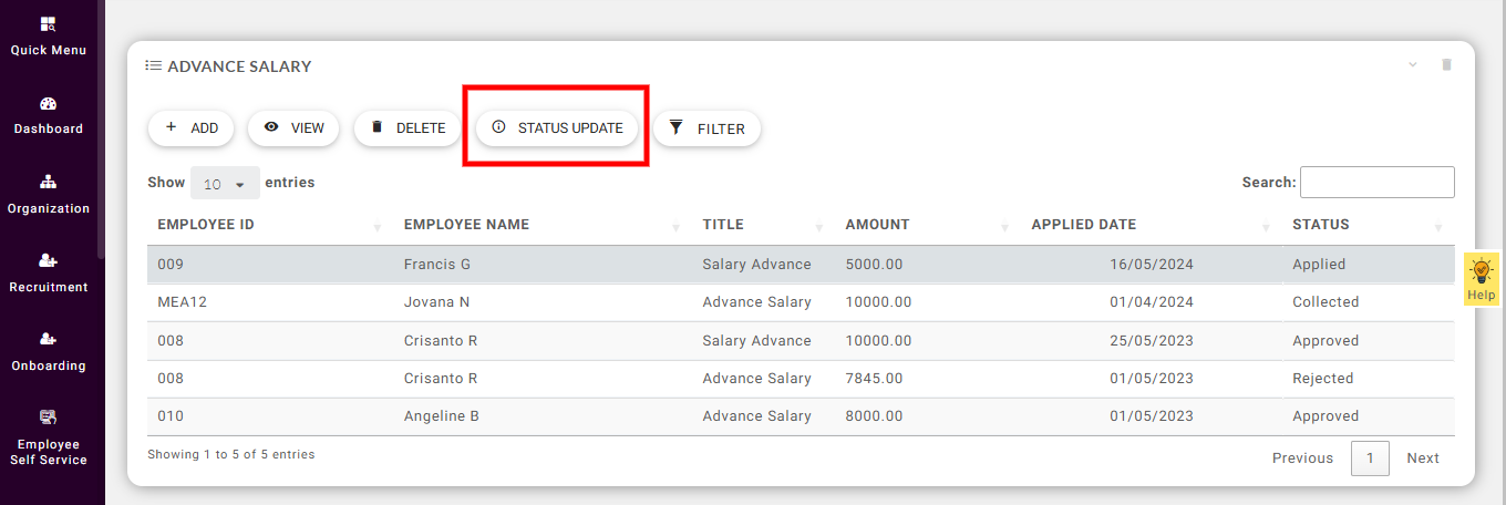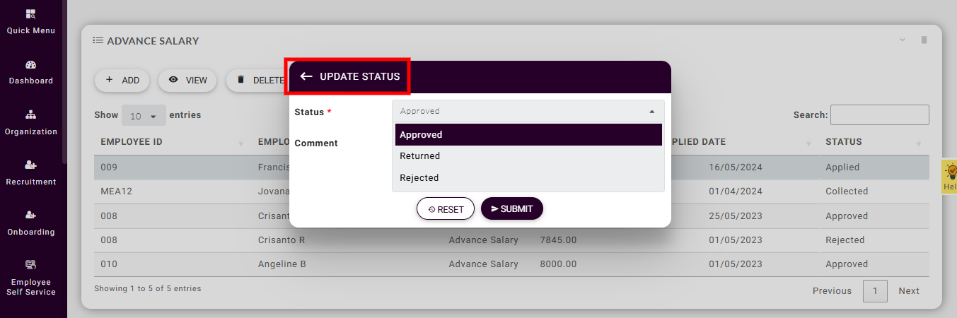 To approve a deduction record, select the entry and click the Status Update button, then choose either Approve or Reject.