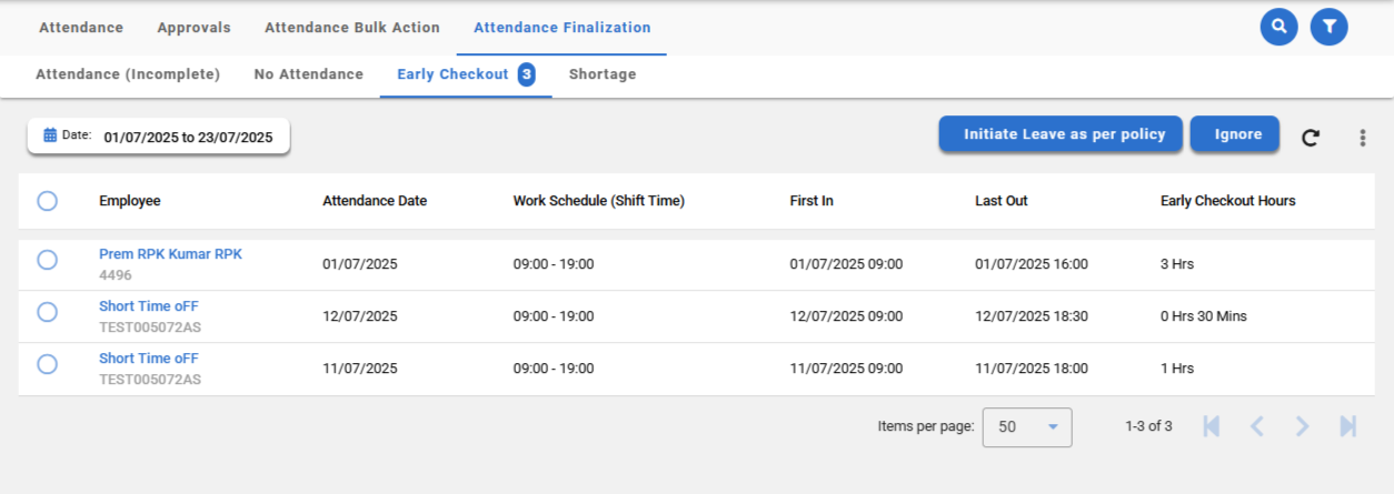 You can choose to either initiate leave as per the policy or ignore the Early Check-Out record without applying any penalty.