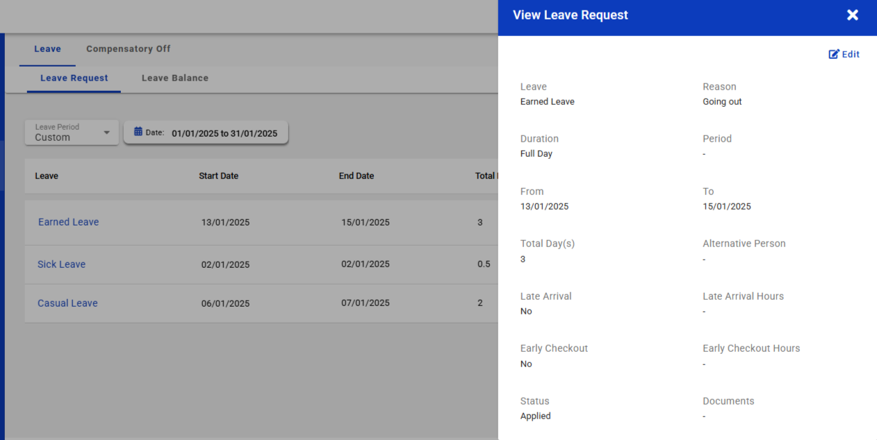 This feature helps you easily track leave history or plan future time off within your selected timeframe.