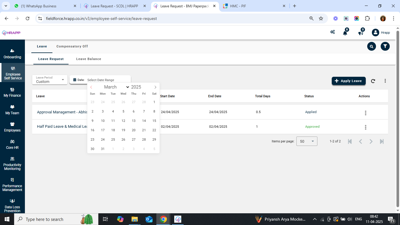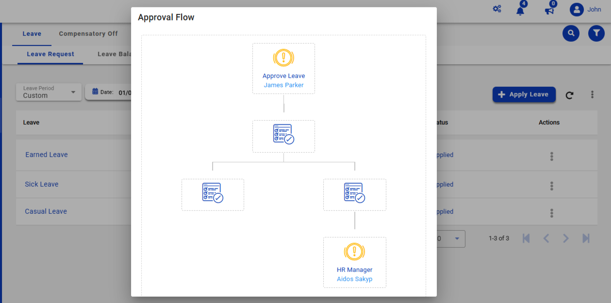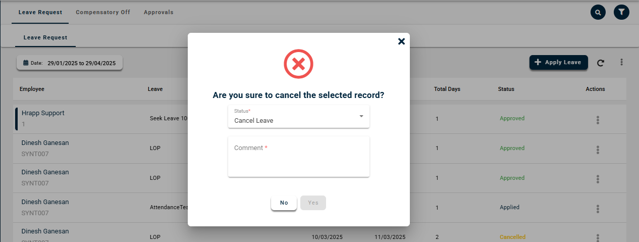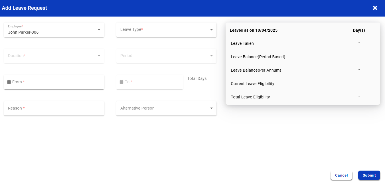To apply for a leave request, click the +Apply Leave button on the right-hand side. A pop-up window will open, where employees must fill in all the mandatory fields and submit the request.