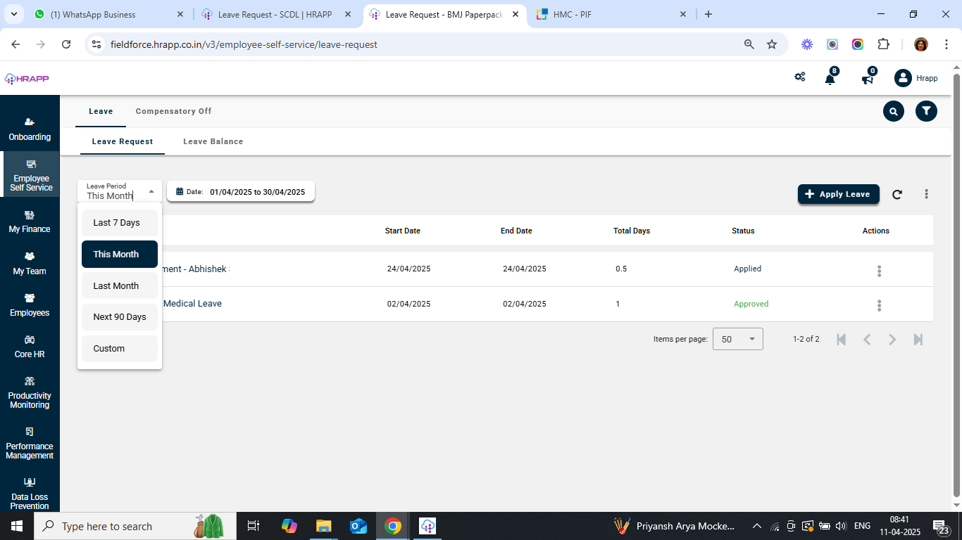 By default, the grid displays leave data for the current month only.To view past or upcoming leave records, use the Leave Period dropdown. You can choose from the following options:
