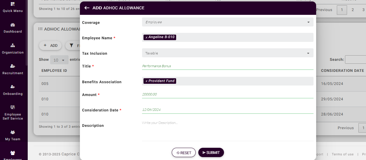 Fill all mandatory fields in the form. Click Submit to save the ad hoc allowance.