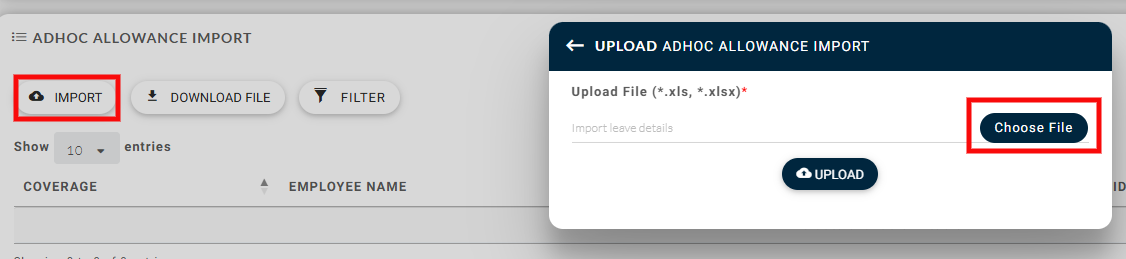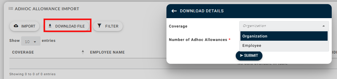 2.Click the Download File and specify the Coverage either at Organization level(Applicable to the entire organization) or Employee Level(Applicable only for the Employees that have been imported for the ad-hoc allowance). If the coverage is Organization then Number of Ad hoc Allowance is mandatory.This will generate a predefined Excel template.
