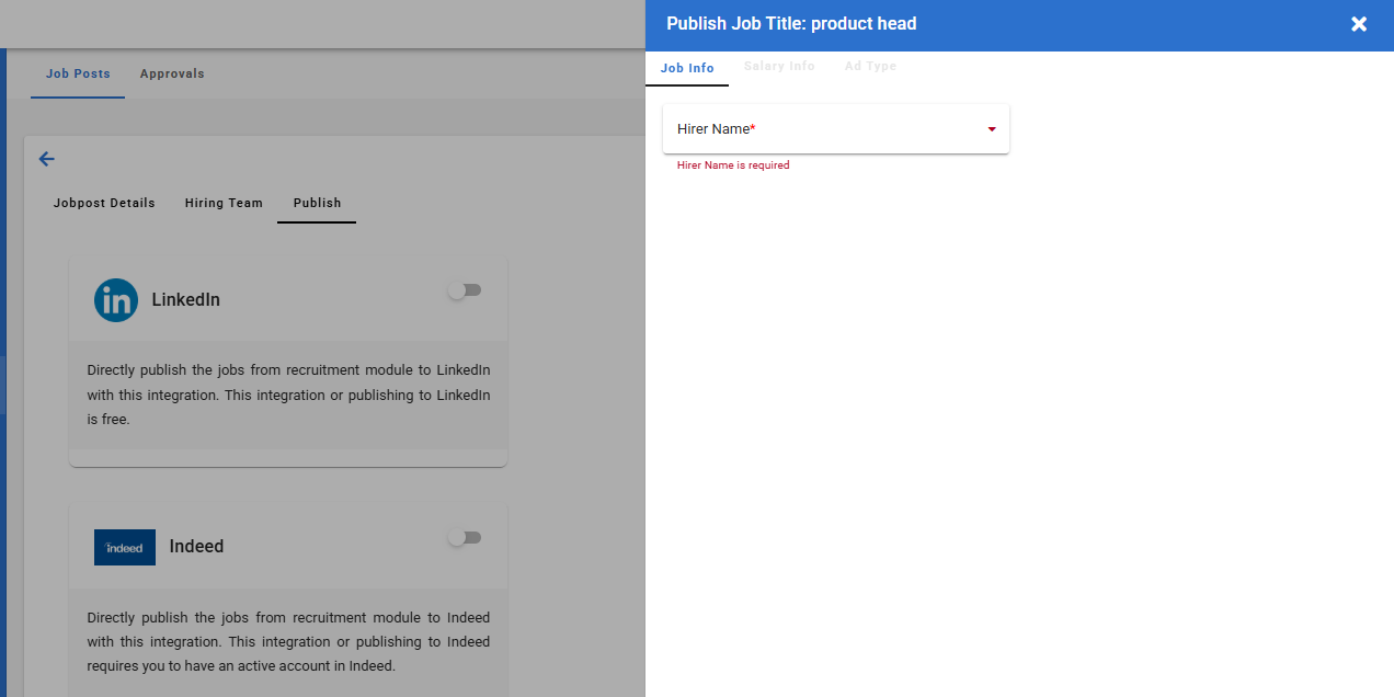 Once the integration is enabled in the settings, the corresponding job portals will automatically appear within the job post.