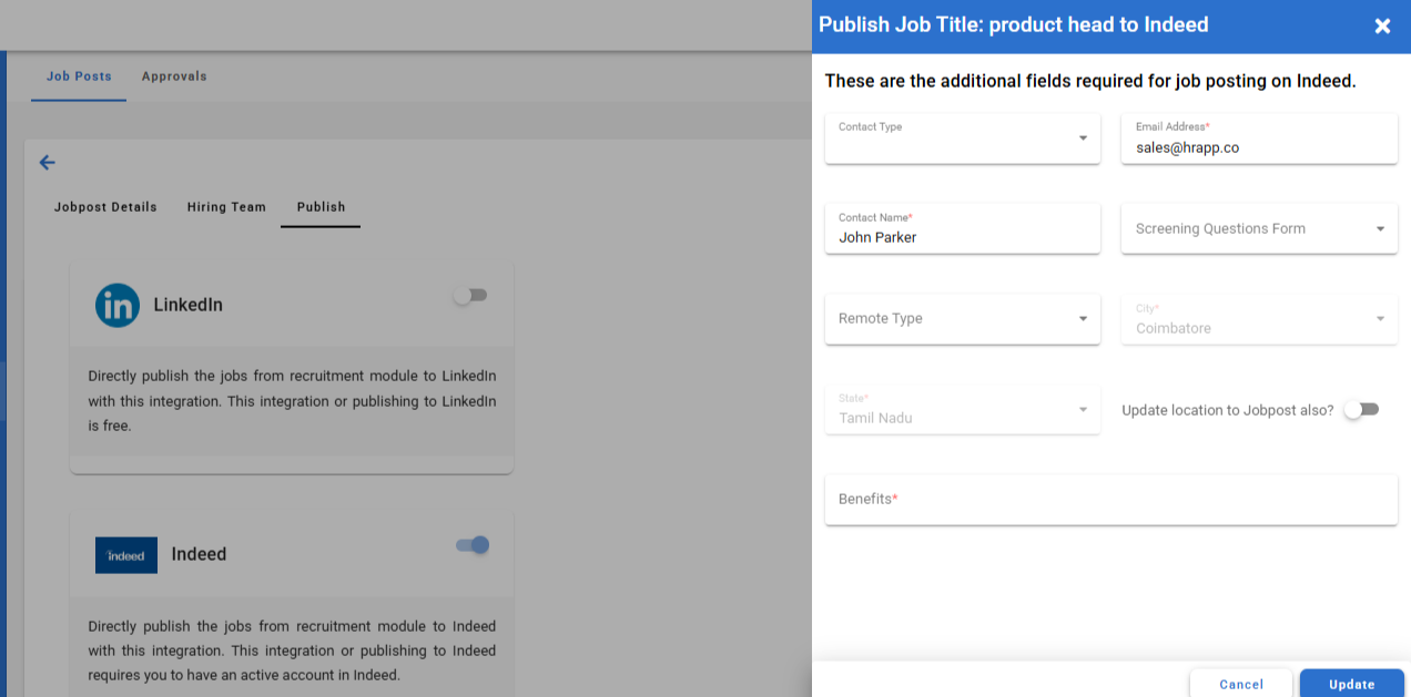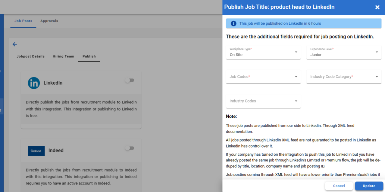 Click Update to publish the job post to the selected portal.