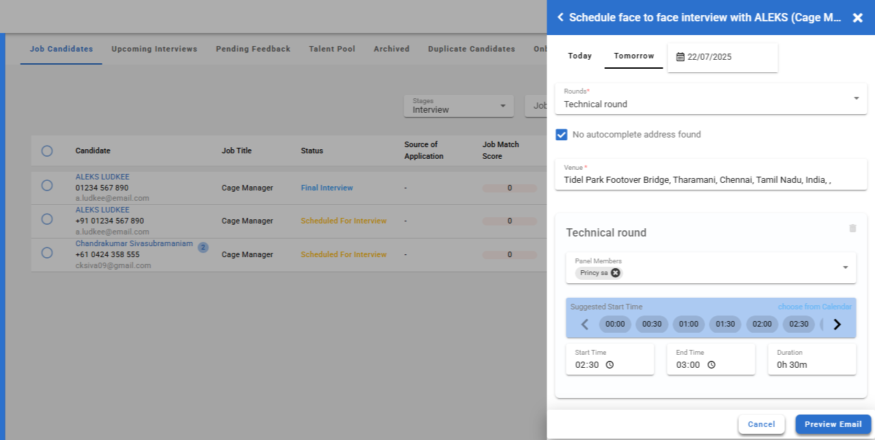 Finally, click Schedule Interview to send an email notification to both the candidate and the interview panel member with the scheduled interview details.